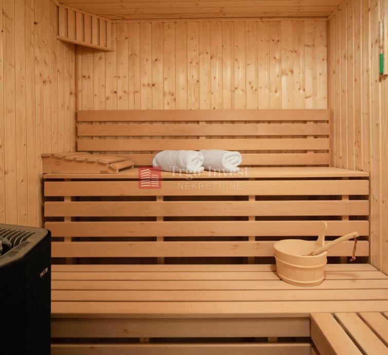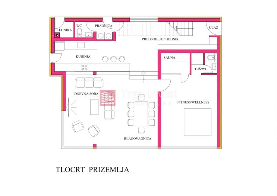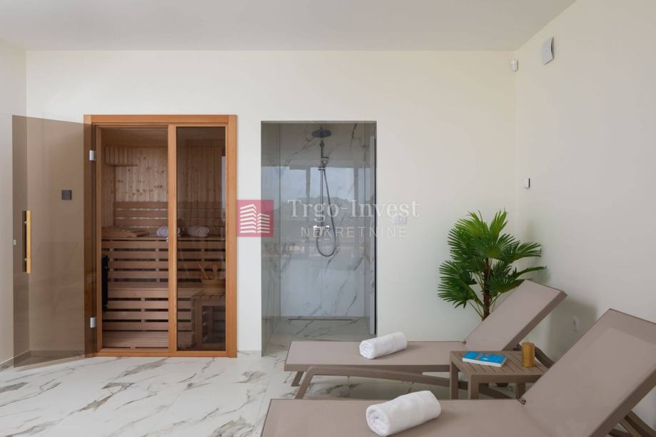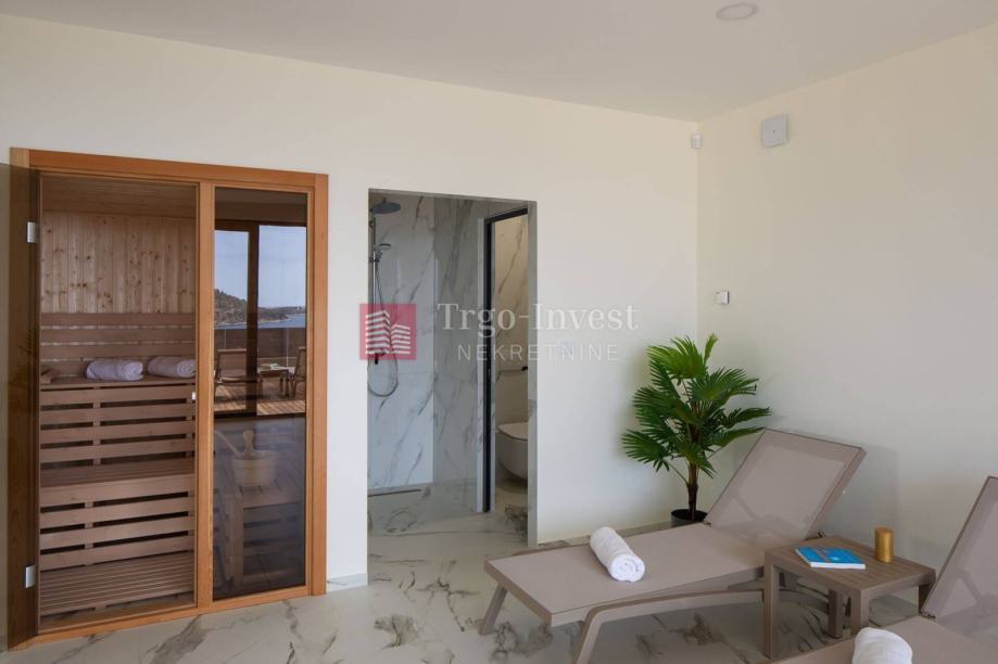 U prizemlju se nalazi prostrani dnevni boravak, kuhinja, blagovaonica i praonica s perilicom i sušilicom rublja, odvojena kupaonica i wellness soba sa saunom i jacuzzijem gdje se možete u potpunosti prepustiti svim užicima wellness opuštanja uz prekrasan pogled na zalazak sunca.