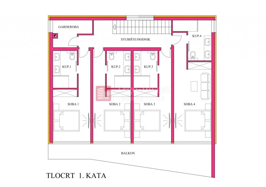 Vila površine 260 m2 ima smještajni kapacitet za osam osoba. Četiri potpuno opremljene spavaće sobe s bračnim krevetima nalaze se na gornjoj etaži s prekrasnim pogledom na more. U jednoj sobi se nalazi pomoćni kauč na razvlačenje dimenzija 130x190 cm, prilagođen za djecu. Privatne kupaonice imaju tuš kabinu s raznim popratnim sadržajima poput sušila za kosu, ručnika, sapuna. Pahuljasti frotire ogrtači su na raspolaganju svakoj osobi.