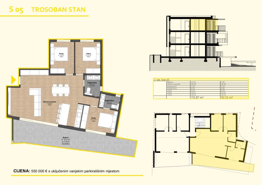 ukupne podne površine 115,97 m2 (obračunske površine 92,53 m2); cijena stana iznosi