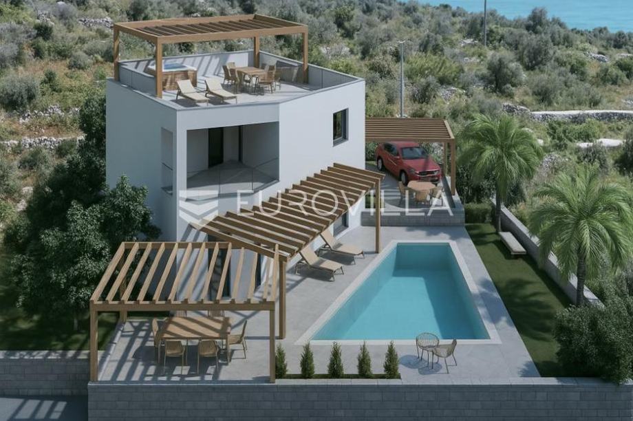 Rogoznica, luksuzna vila s bazenom i garažom bruto površine 168,71 m² na parceli od 597 m². Vila je trenutno u izgradnji, što kupcu daje mogućnost izmjena, te odabira materijala i opreme.Vila se sastoji od prizemlja i prvog kata. U prizemlju se nalazi prostrani dnevni boravak s kuhinjom i blagovaonicom, spavaća soba i kupaonica. Iz dnevnog boravka izlazi se na natkrivenu terasu pored koje je i grijani bazen. Velike staklene stijene pružaju obilje prirodne svjetlosti. Na katu se nalaze još 3 spavaće sobe, od kojih svaka ima privatnu kupaonicu. Jedna spavaća soba ima izlaz na terasu.Oko vile se prostire lijep vrt, te prostor za sunčanje. Vila osim garaže za dva automobila ima i parking za još 2 automobila. Mikrolokacija vile je odlična, blizu mora, te samo jedan kilometar od centra Rogoznice. Vila je trenutačno u izgradnji, te je očekivani završetak gradnje travanj 2026. godine.Za sve ostale informacije stojimo Vam na raspolaganju....