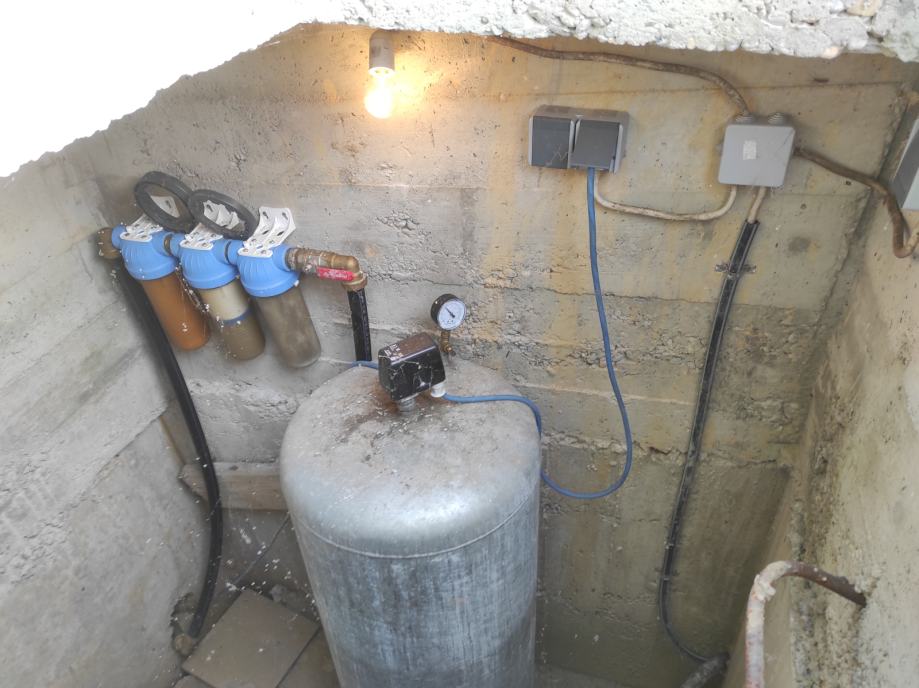 - Do objekta je povučena voda; trenutno bunarska. Kraj bunara je napravljen bunker u kojem se nalazi hidrofor i filteri za vodu. Pumpa je potopna. Parcela ima priključak na gradski vodovod(2022.) te postoji cijev od njega do bunkera samo ga je potrebno povezati na postojeći sustav. Instalacije za vodu su provedene kroz kuću(2022.) no negdje se gubi pritisak pa je to potrebno ispraviti.