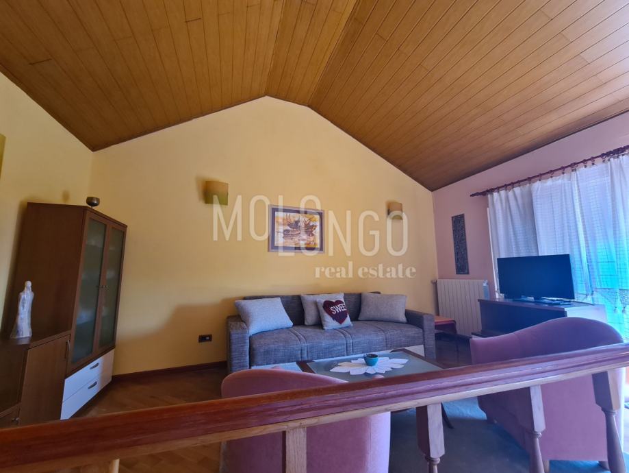 Sastoji se od dva dvoetažna stana, svaki otprilike 100 m2 korisne površine plus terase i balkoni. Jedan stan modernije uređen i opremljen sa komplet namještajem po mjeri. Drugi stan održavan i useljiv.