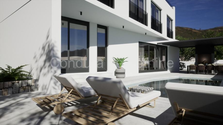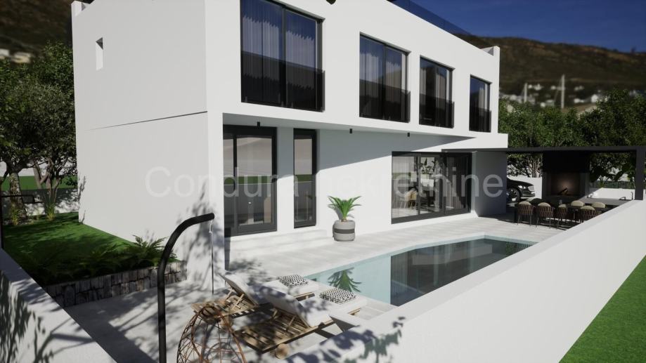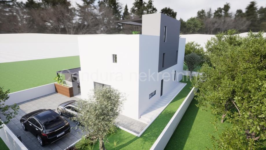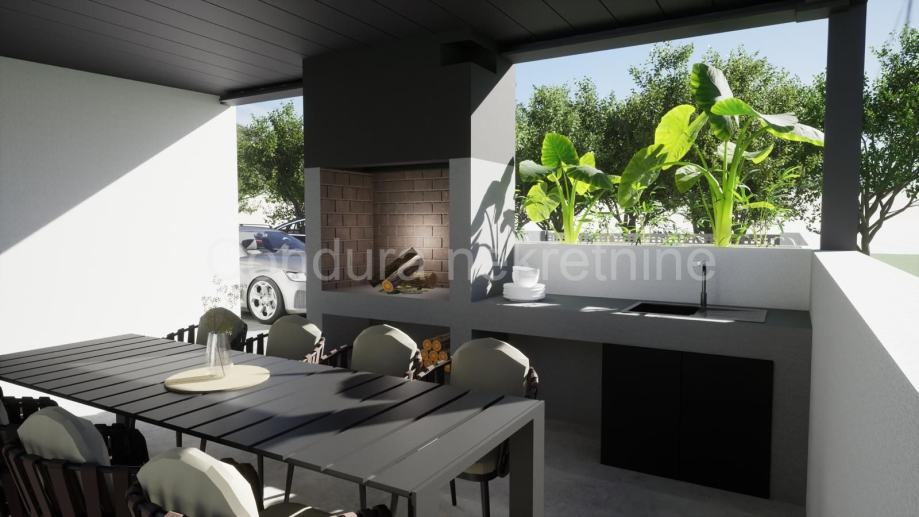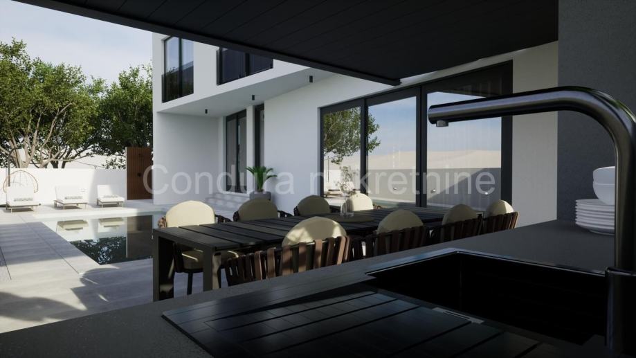 U dvorištu se nalazi vanjska kuhinja, terasa zamišljena kao prostor za druženje na koju se iz kuće izlazi kroz velike staklene stijene te grijani bazen (cca 30 m2) odmah uz terasu. Također, u dvorištu se nalaze 2 parkirna mjesta.
