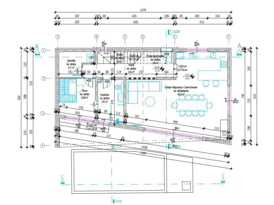 Ukupna neto površina kuće je 214,92 m2, a prostire se na prizemlje i kat, s izlazom na krovnu terasu.