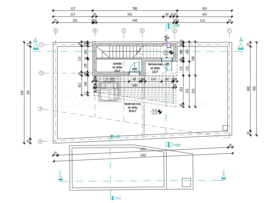 Na krovnoj terasi s pogledom na more nalazi se spremište, nadstrešnicom natkriveni dio terase površine 2,92 m2 i nenatkriveni dio terase površine 86,48 m2.