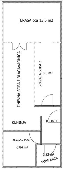 Prizemlje 37,5 m2 (dvije spavaće sobe, kupaonica, dnevna i kuhinja) i 15 m2 natkrivene terase, peć na drva.