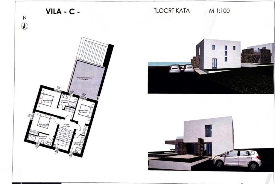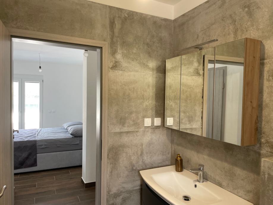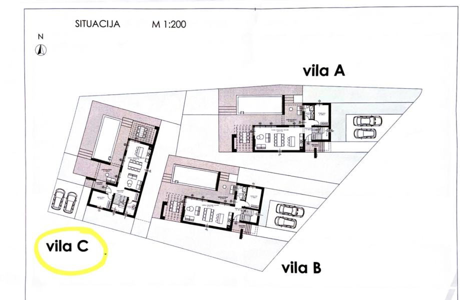Unutarnje stepenište vodi na prvi kat ville, gdje se nalaze 3 spavaće sobe od kojih svaka soba ima svoje kupatilo, klimu, te pogled na more. Jednoj spavaćoj sobi pripada terasa veličine 22 m2.
