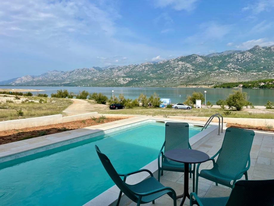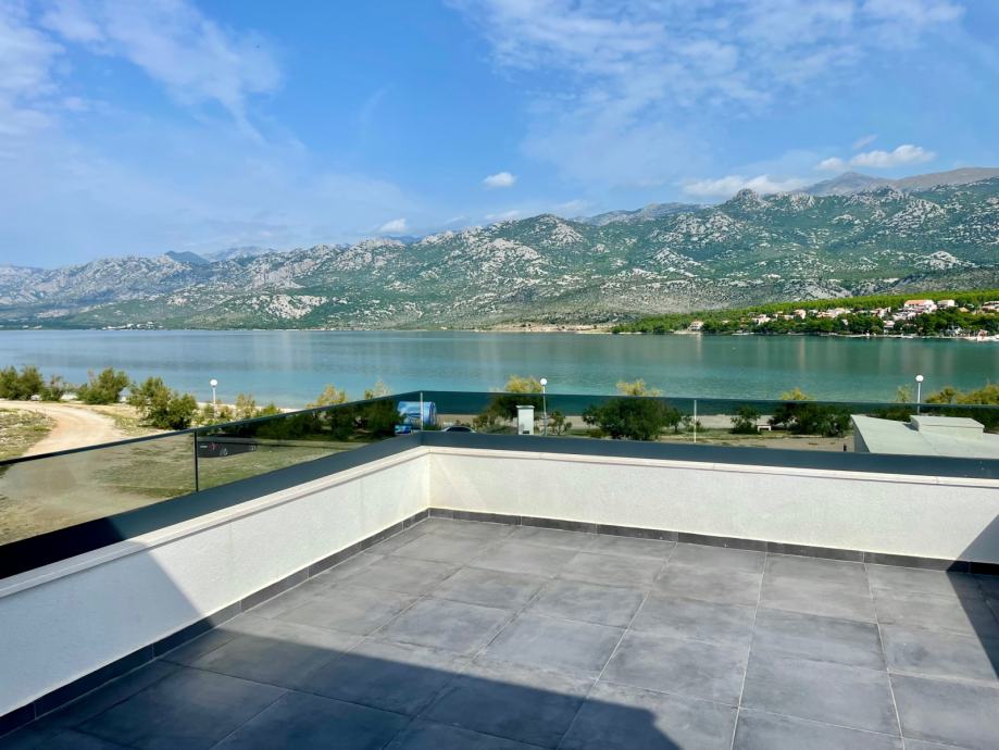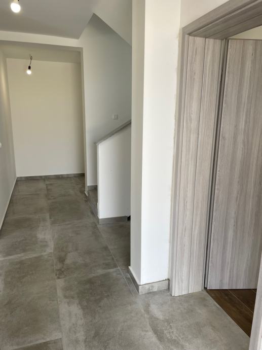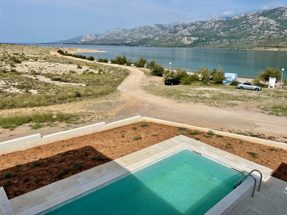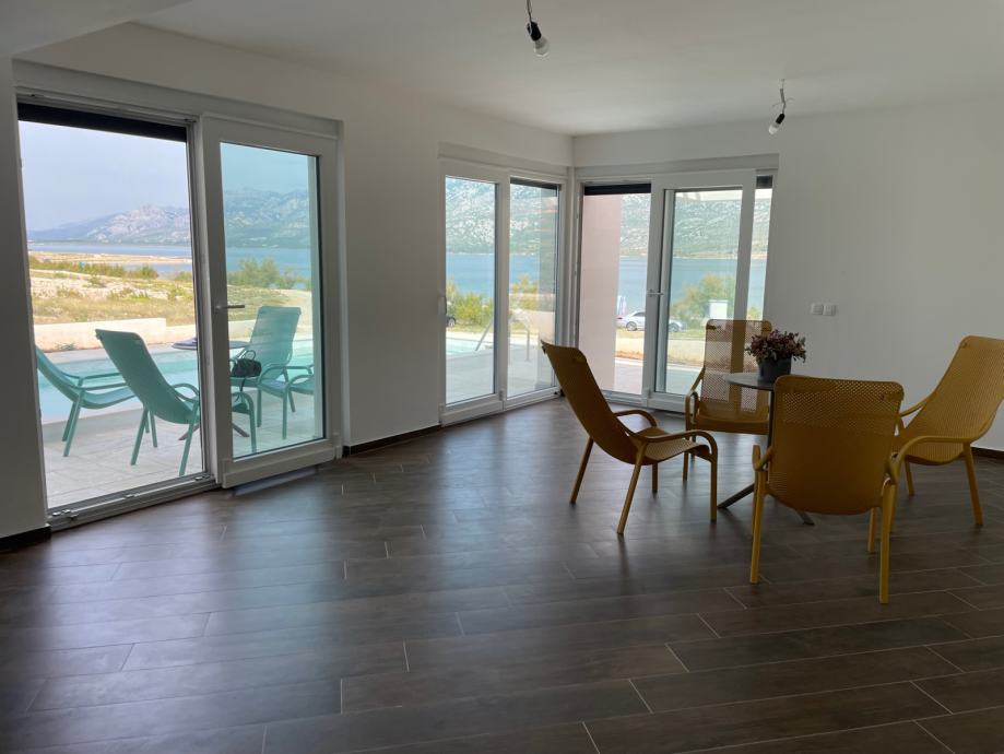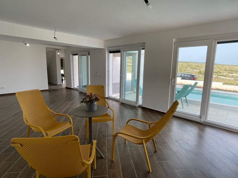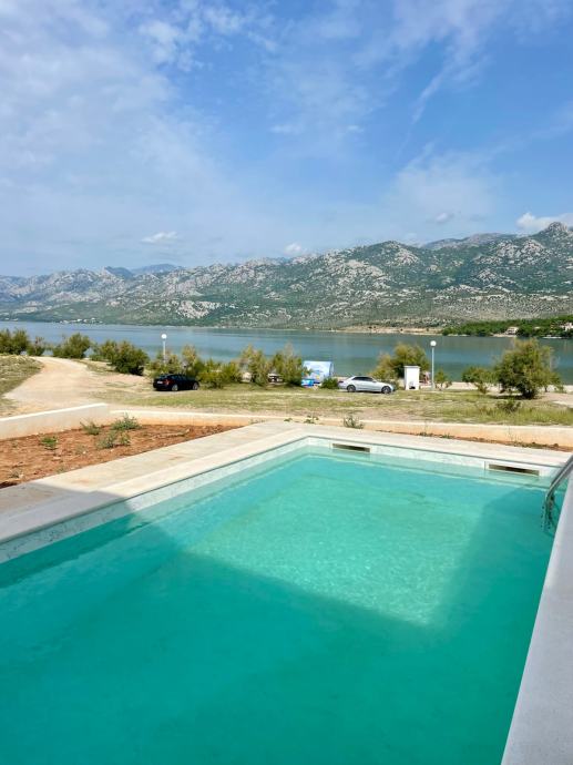 Prizemlje čine dnevni boravak, kuhinja i blagovaonica otvorenog koncepta u kojima je jako puno prirodne svjetlosti. U prizemlju se također nalazi hodnik, jedno kupatilo sa tušem, te uredski prostor koji se svakako može koristiti kao dodatna spavaća soba. Iz dnevnog boravka ima više izlaza na prostranu terasu, te očaravajući pogled na more i Velebit. U dvorištu se nalazi veliki vanjski roštilj, prostor za druženje, vrt, te prelijepi, tirkizni bazen.