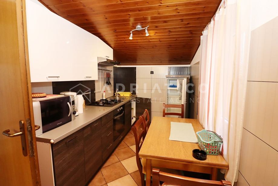 Na prvom katu se nalazi prostran stan koji se sastoji od predsoblja, kuhinje i blagovaonice, dnevnog boravka s izlazom na veliku terasu, dvije spavaće sobe, kupaonice i toaleta.