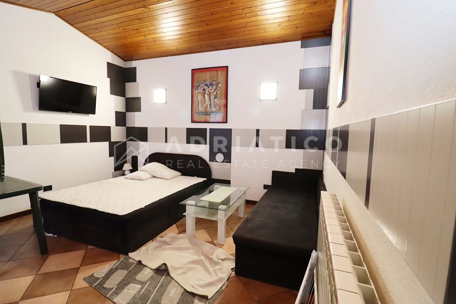 Prizemlje je podijeljeno na jedan dvosoban apartman s velikom terasom i jedan jednosoban apartman.