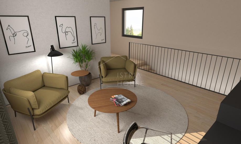 Na katu se nalaze dvije spavaće sobe, dvije kupaonice te galerija namijenjena dječjim ili drugim sadržajima (tv, igraonica, radna soba).