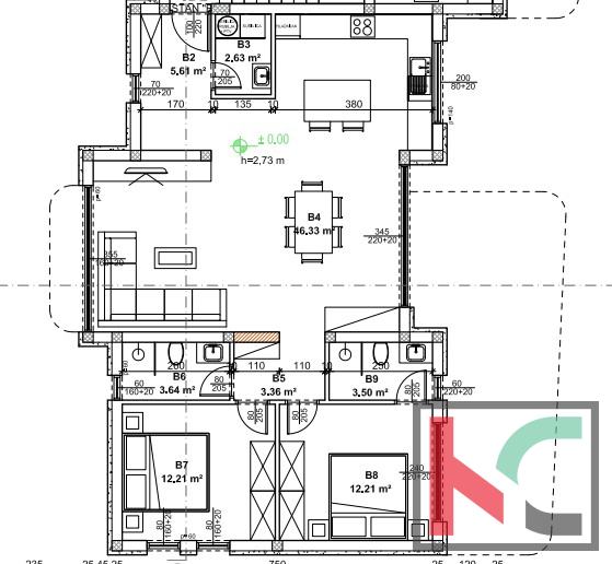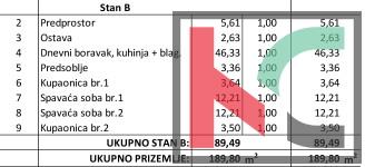 Sastoji se od ulaznog predsoblja, ogromnog dnevnog prostora koji obuhvaća dnevni boravak, kuhinju s blagovaonom te izlazom na terasu i vrt, wc, te dvije en suite spavaće sobe. Uz stan u vlasništvu i ostava od cca 10tak m2 te parkirno mjesto. Planirani završetak radova sredina 2023. godine.