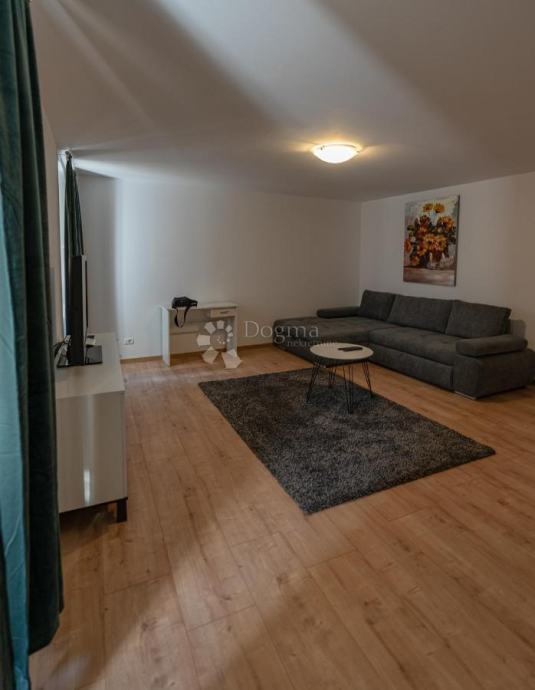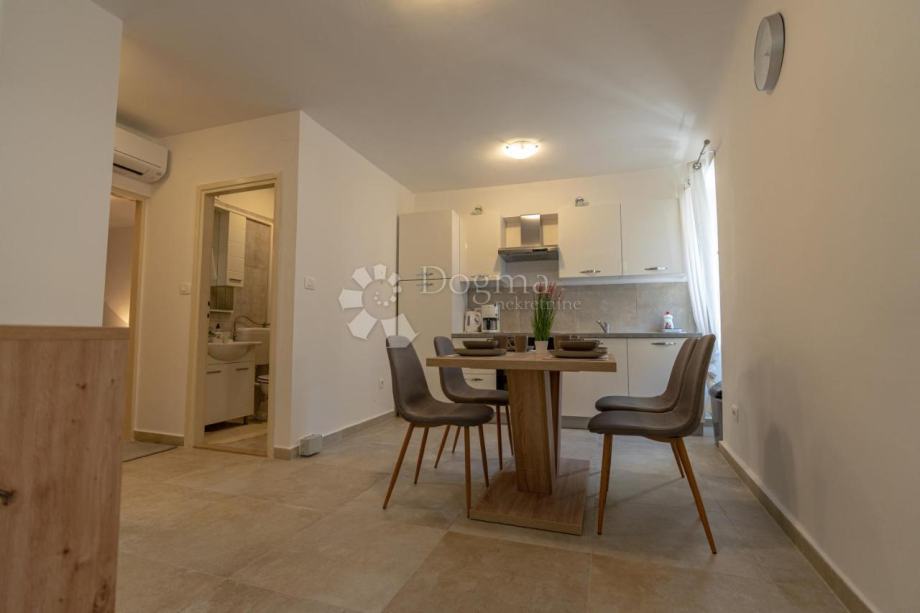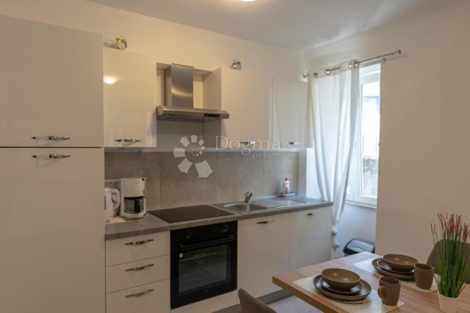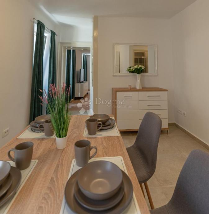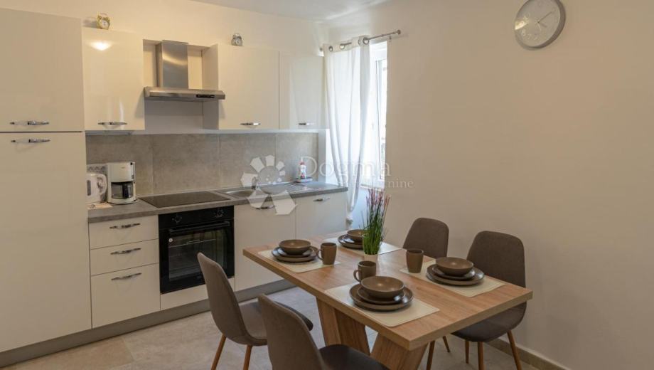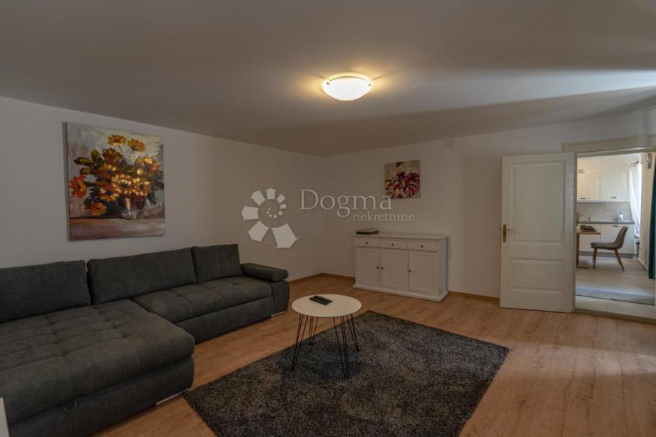 Stan se nalazi na prvom katu obnovljene kamene zgrade te obuhvaća 70 m² zatvorenog prostora. Sastoji se od prostranog dnevnog boravka (20 m²), moderne kuhinje s blagovaonicom, hodnika, elegantne kupaonice, ostave i prozračne spavaće sobe s izlazom na šarmantnu terasu. Na terasi se nalazi očuvana šterna, koja prostoru daje poseban karakter.