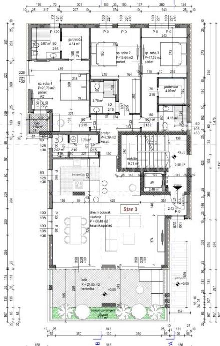 Stan na prvom katu stambene površine od 189m2 sastoji se od ulaznog hodnika, kuhinje, blagovaonice i prostranog dnevnog boravka u jednom s izlazom na veliku terasu, tri spavaće sobe s vlastitim kupaonicama i garderobama, lođe, pomoćne sobe i toaleta.