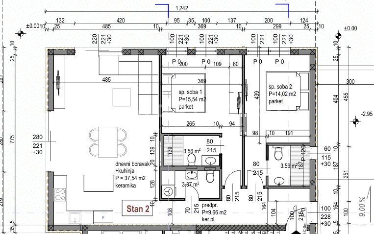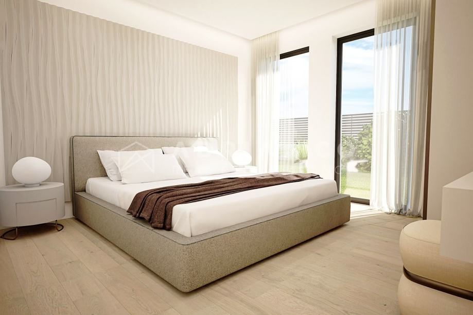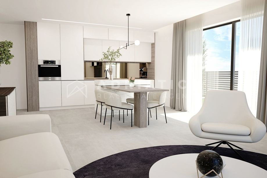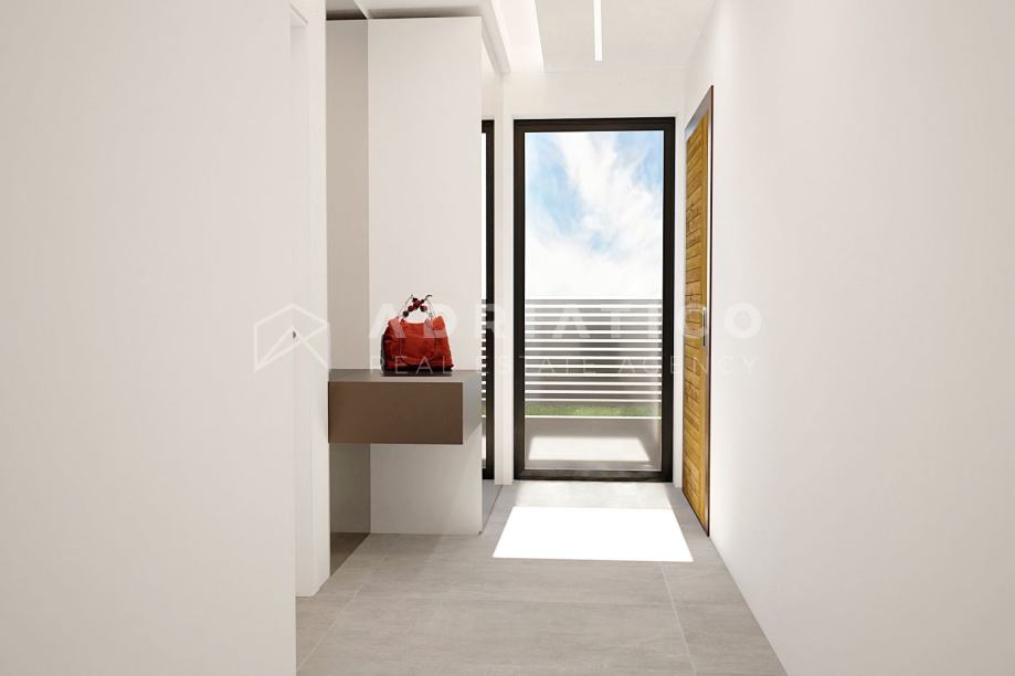 Stan u prizemlju stambene površine od 87m2 sastoji se od ulaznog hodnika, kuhinje, blagovaonice i dnevnog boravka u jednom s izlazom na veliku terasu, dvije spavaće sobe s vlastitim kupaonicama, pomoćne sobe i toaleta.