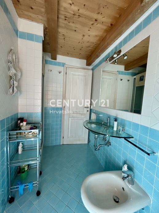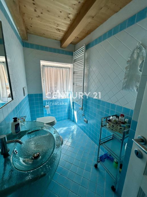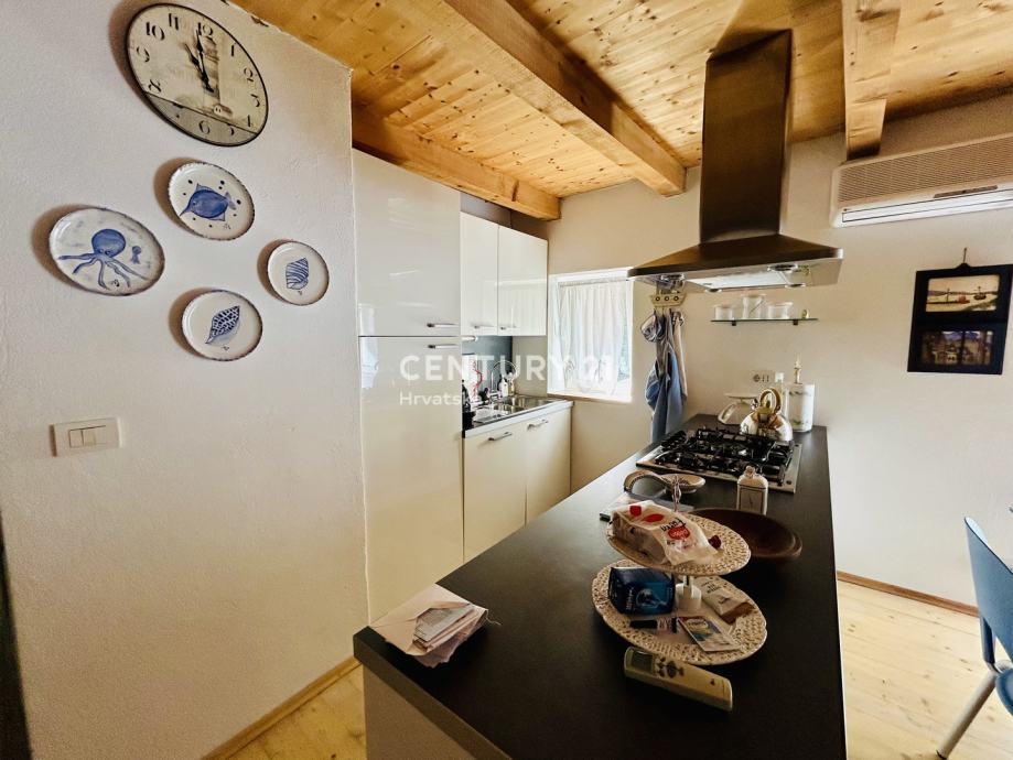 Stan se sastoji od ulaznog hodnika komunikacije, kuhinje sa blagavaonom, odvojenog dnevnog boravka, spavaće sobe i kupaonice na prvoj etaži, te na drugoj etaži do koje stižemo unutarnjim stepeništem na kojoj se nalaze spavaća soba, lobb/ knjižnica/ radna soba, kupaonica, terasa površine 8 m2 sa lijepim pogledom, malo spremište/vešeraj.