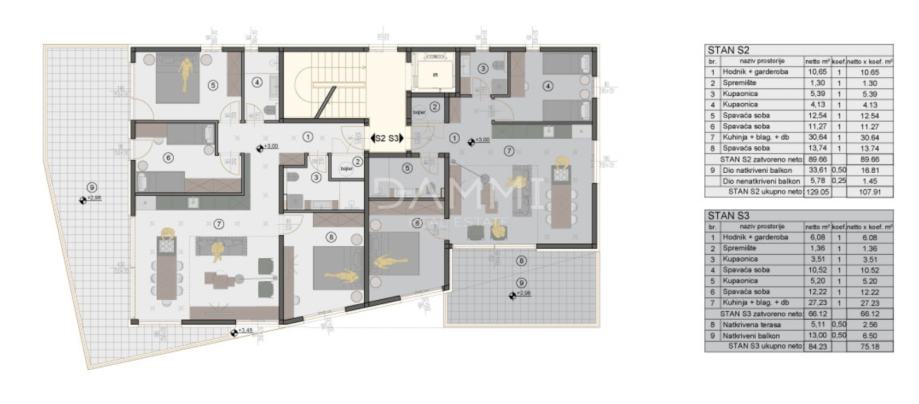 Stan na prvom katu, površine 129 m2, sastoji se od 3 prostrane spavaće sobe, 2 luksuzne kupaonice, kuhinje, dnevnog boravka, spremišta te garaže