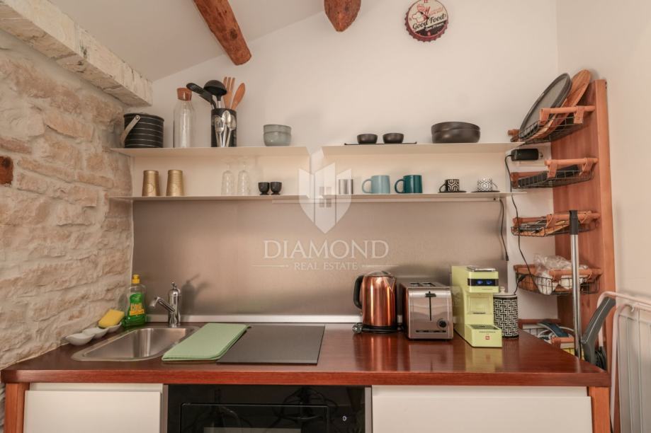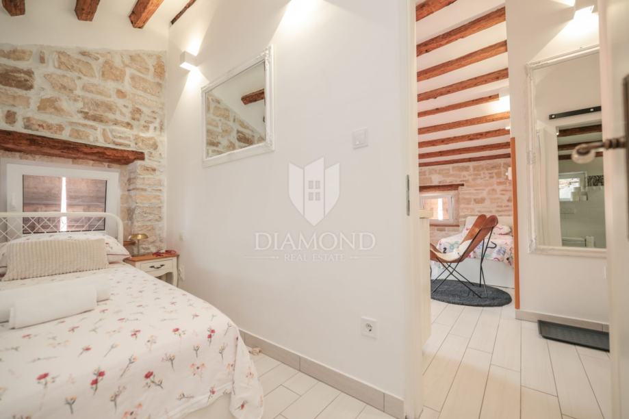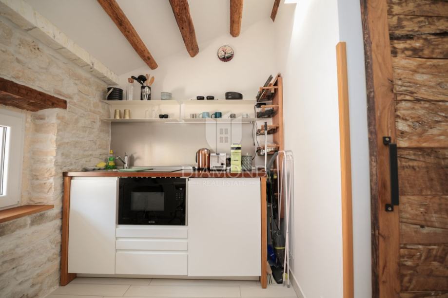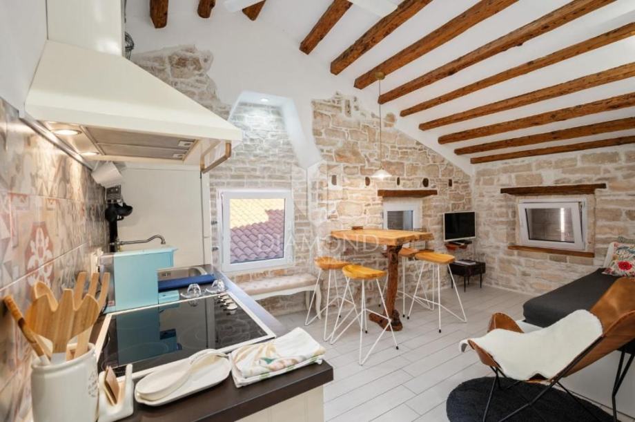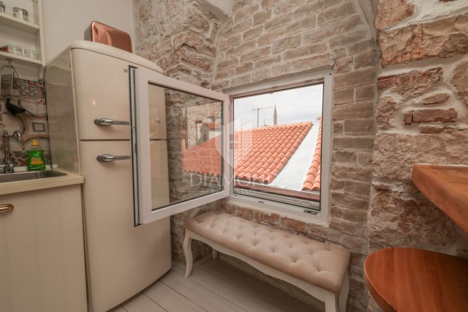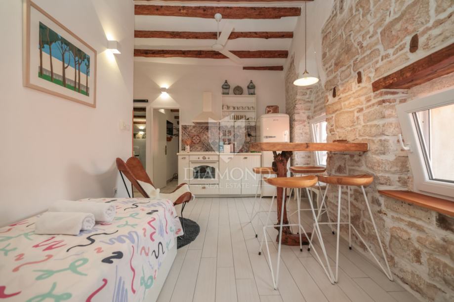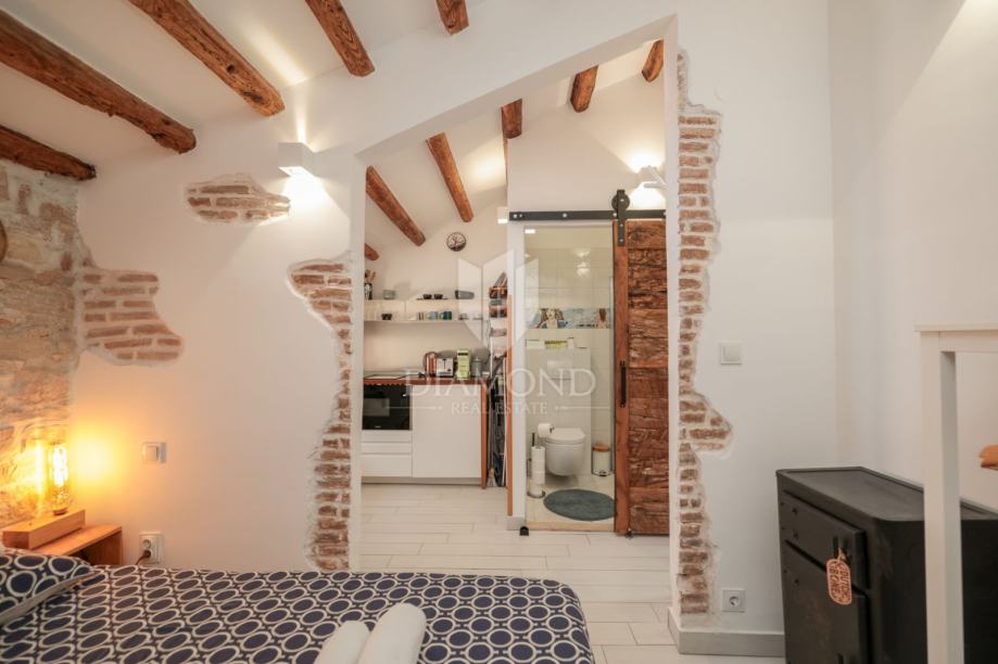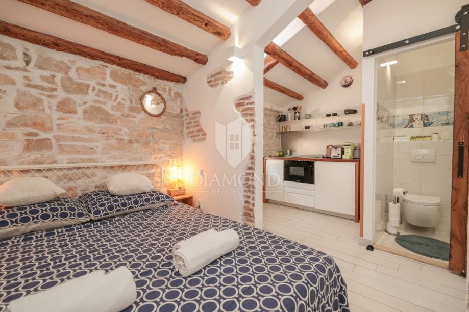 U samom centru starogradske jezgre Rovinja prodaju se dva posebna stana, etažirana kao jedna cjelina – studio od 16 m² i stan od 30 m². Stanovi se nalaze na trećem katu uredne zgrade s odličnim širokim drvenim stepenicama i zaista širokim ulaznim hodnikom.