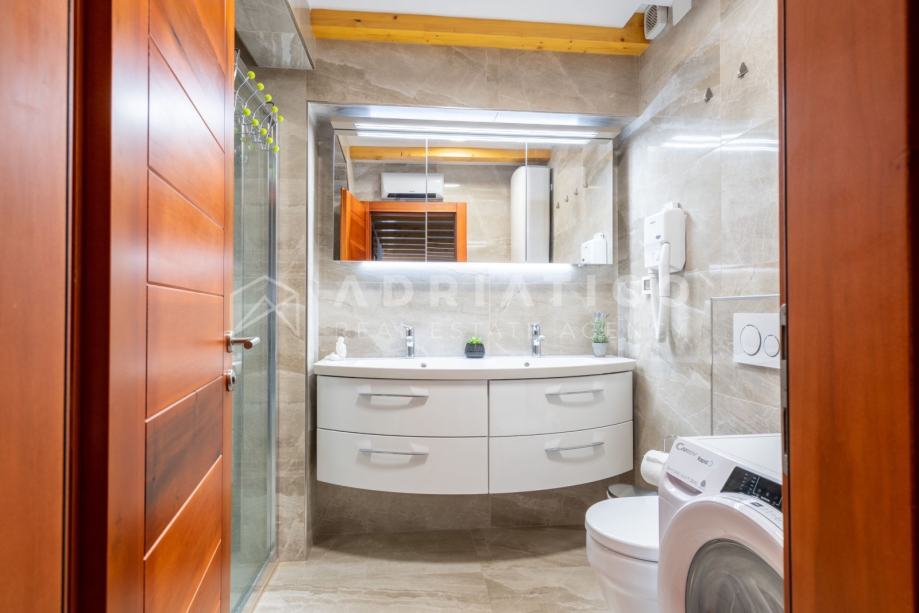 Ovaj prekrasan prostoran stan nalazi se na 1. katu zgrade smještene na samo par koraka od rive i centra.