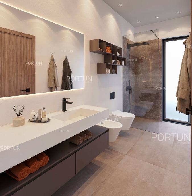 Moderan i prozračan stan s dvije spavaće sobe smješten je u Rovinju, u neposrednoj blizini plaže i šetnice koja vodi do starogradske jezgre. Nalazi se na prvom katu urbane vile koja utjelovljuje sofisticiranost, jednostavnost i moderni dizajn. Dnevni boravak dizajniran je po konceptu open space, čineći svijetlu i prostranu cjelinu zajedno s kuhinjom i blagovaonicom, a tu je i izlaz na natkrivenu terasu. Stan je idealan za četveročlanu obitelj, s dvije spavaće sobe, od kojih svaka ima svoju kupaonicu. Uz stan dolaze garaža i spremište u prizemlju zgrade, te jedno dodatno parkirno mjesto u dvorištu. Prema dogovoru budućih vlasnika i investitora, stan se može opremiti kuhinjom i drugom posebnom opremom. Atraktivan položaj u blizini plaže i povezanost šetnicom sa starogradskom jezgrom Rovinja čine ovaj stan savršenim kako za život, tako i za iznajmljivanje. KLJUČNE OSOBINE✔ Izvrsna pozicija u Rovinju✔ Plaža 350 m ✔ 1. kat✔ 2 Spavaće sobe | 2 Kupaonice✔ Garaža✔ Parkirno mjesto za jedan automobil