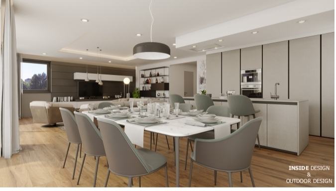 Prostrani apartmani osmišljeni su u svakom detalju i izgrađeni su s visokokvalitetnim materijalima. Sastoje se od ulaznog hodnika, otvorene kuhinje, blagovaonice i dnevnog boravka otvorenog prema terasama, gostinjskog WC-a, ostave i 2 ili 3 spavaće sobe s garderobom i vlastitim kupaonicama.