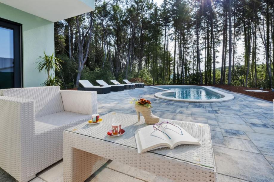Iz dnevnog boravka i spavaćih soba izlaz na veliku terasu sa bazenom, sunčalištem,roštiljem i predivno uređenom i ograđenom okućnicom. U potpunosti klimatizirana sa energetskim certifikatom A+ Dodatna mogućnost ugradnje kamina i grijanje na drva. Tri parkirna mjesta. Prodaje se kompletno namještena i uređena.