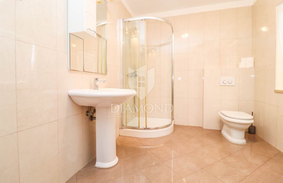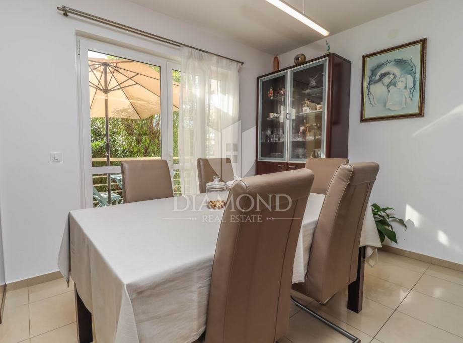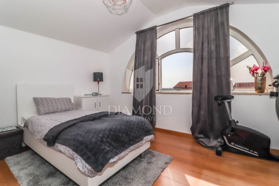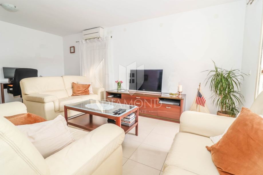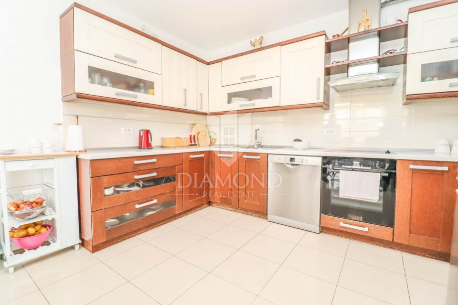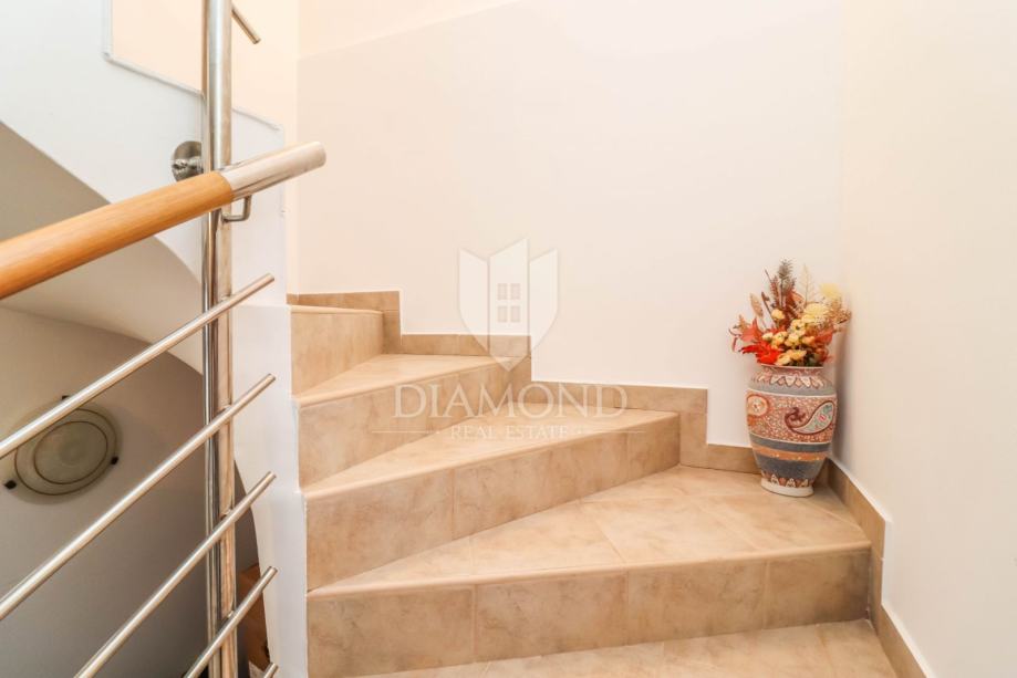 Kuća je dio duplexa te je izvedena kao jedna velika i prostrana stambena jedinica. Proteže se kroz tri etaže, prizemlje i dva kata. U prizemlju se nalazi ulazni pred prostor sa širokim stepeništem prema etažama, velikom kupaonicom, prostrani dnevni dio sa kuhinjom i blagovaonicom te izlazom na dvije terase, od kojih je veća natkrivena i idealna za odmaranje i uživanje u suncu. Na katu se nalaze dvije spavaće sobe i kupaonica. Soba na katu ima i svoj balkon. Na drugom katu, koji je zapravo visoko potkrovlje nalaze se još dvije spavaće sobe. Prije desetak godina sve je kompletno renovirano, a nedavno je obnovljena i kupaonica na katu koja ima podno grijanje. Za grijanje i hlađenje tu su vrhunski klima uređaji.