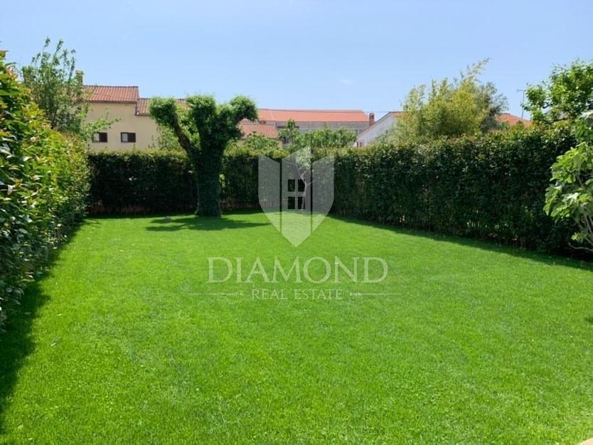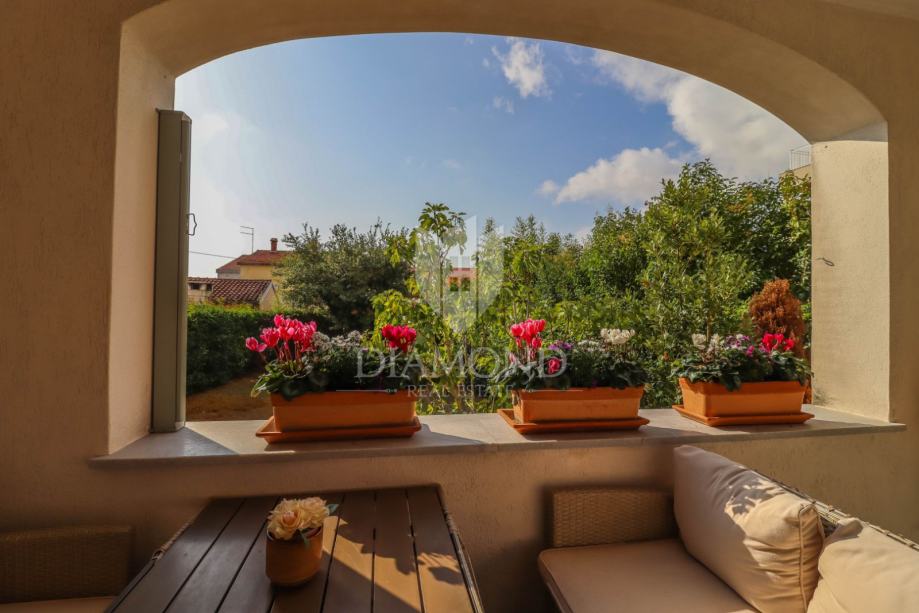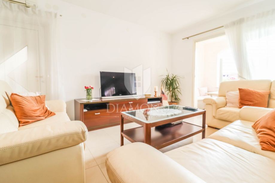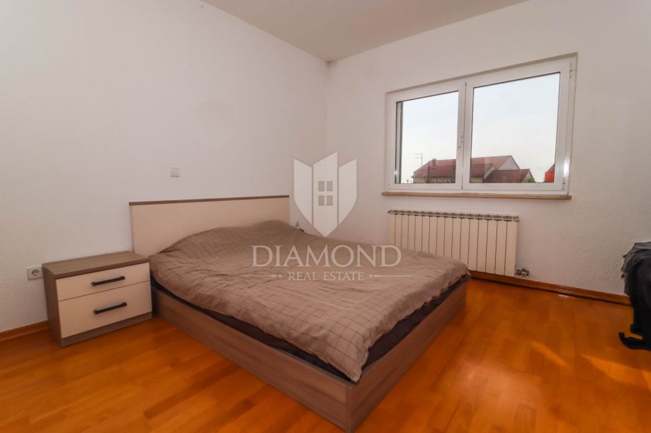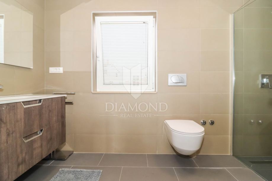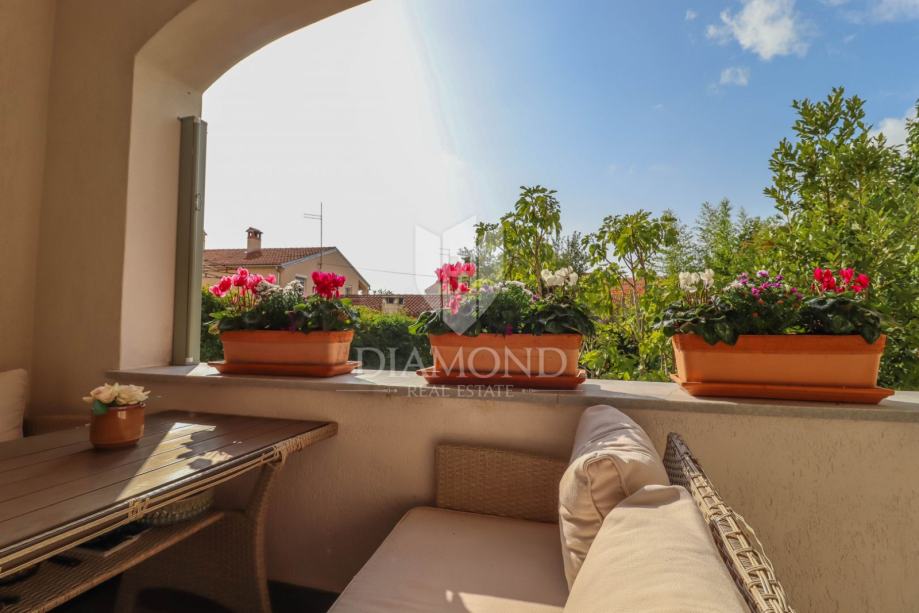 Kuća je dio duplexa te je izvedena kao jedna velika i prostrana stambena jedinica. Proteže se kroz tri etaže, prizemlje i dva kata. U prizemlju se nalazi ulazni pred prostor sa širokim stepeništem prema etažama, velikom kupaonicom, prostrani dnevni dio sa kuhinjom i blagovaonicom te izlazom na dvije terase, od kojih je veća natkrivena i idealna za odmaranje i uživanje u suncu. Na katu se nalaze dvije spavaće sobe i kupaonica. Soba na katu ima i svoj balkon. Na drugom katu, koji je zapravo visoko potkrovlje nalaze se još dvije spavaće sobe. Prije desetak godina sve je kompletno renovirano, a nedavno je obnovljena i kupaonica na katu koja ima podno grijanje. Za grijanje i hlađenje tu su vrhunski klima uređaji.