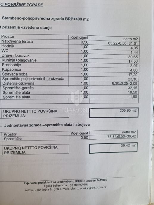 Smještena je na građevinskom zemljištu od otprilike 400 m2, sa još dva dodatna objekta, ukupne bruto površine 270 m2.