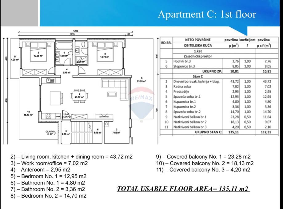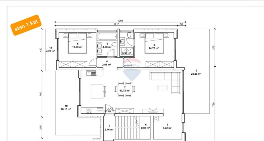 Stan je ukupne površine 135m2 i sastoji se od prostorija iskazanih u tlocrtu,s tim da postoji mogućnost izmjena rasporeda i broja prostorija po želji budućeg kupca.