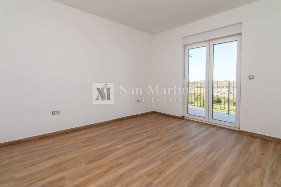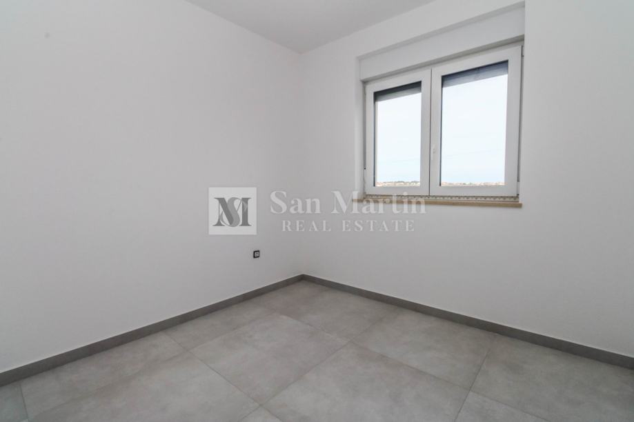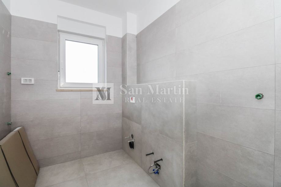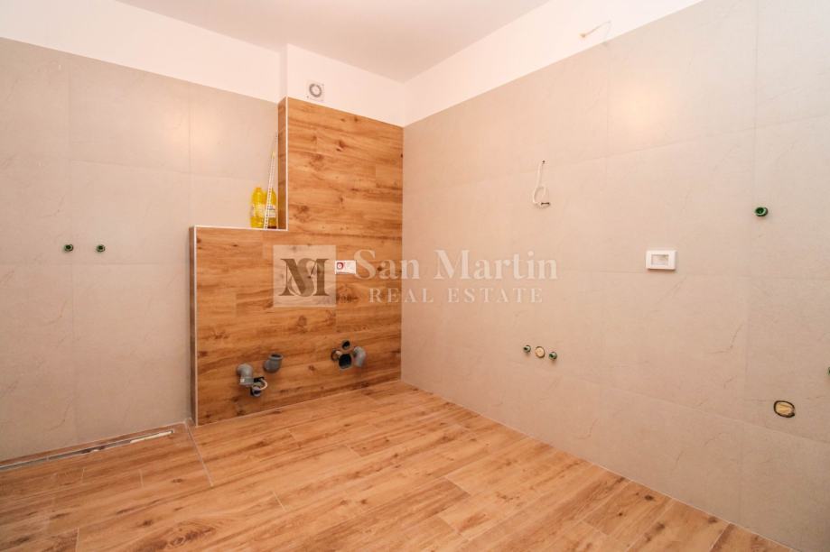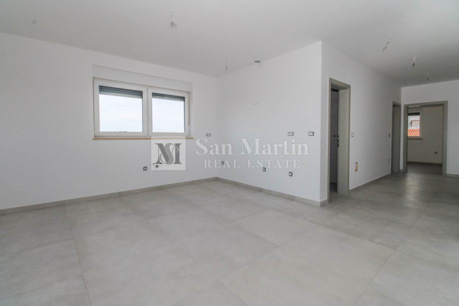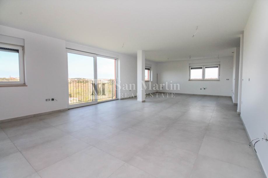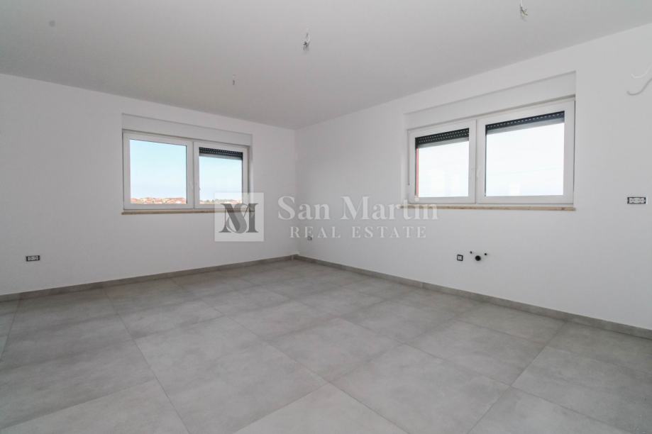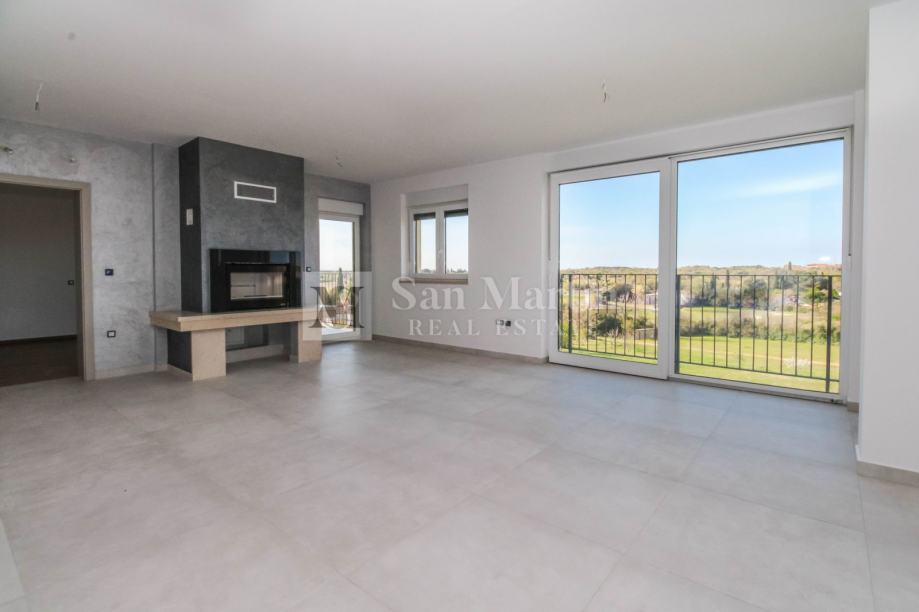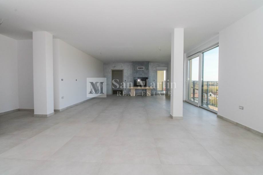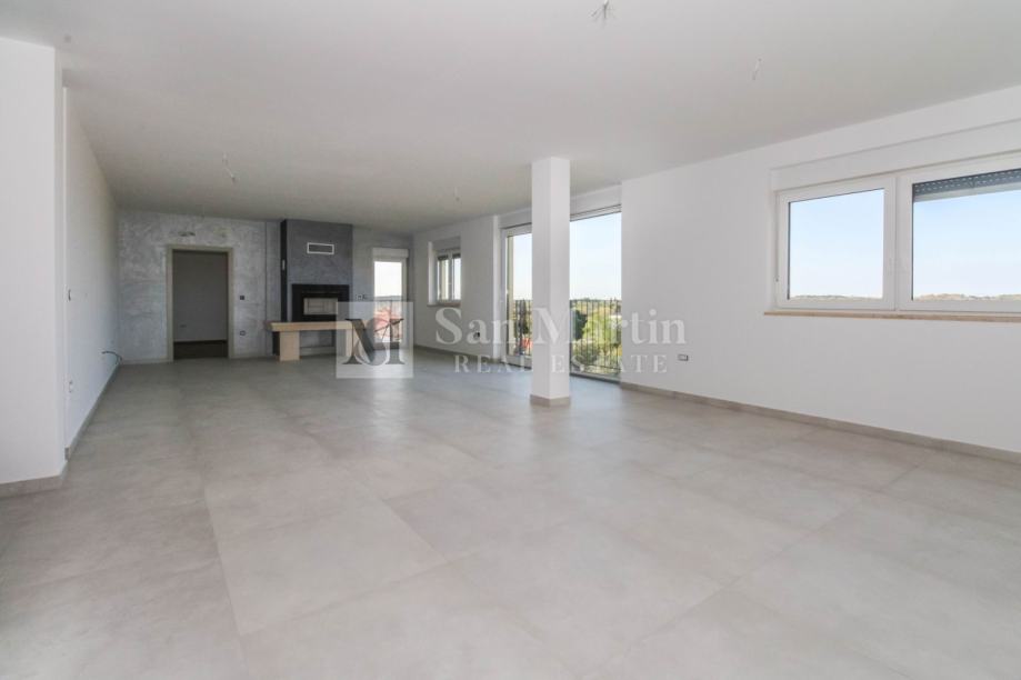 Stan se u naravi prostire kroz 120m2 stambene površine, a sastoji se od ulaznog hodnika, tri spavaće sobe, dvije moderne kupaonice i velikog open space dnevnog boravka s kuhinjom s blagovaonicom te izlazom na terasu. Stan je izuzetno svijetao zahvaljujući velikim prozorima i staklenim stijenama. Za grijanje i hlađenje predviđeni su klima uređaji, a dodatni ugođaj pruža funkcionalni kamin s ventilacijom.