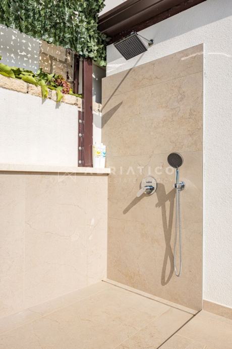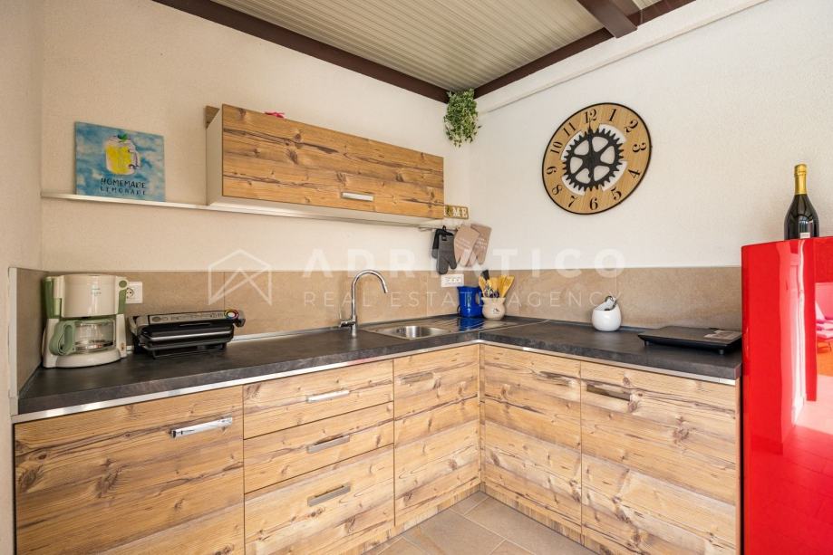 Iz welnessa se izlazi na ukusno uređeno dvorište i vrt gdje se nalaze bazen, natkrivena ljetnja kuhinja, vanjski tuš i toalet.