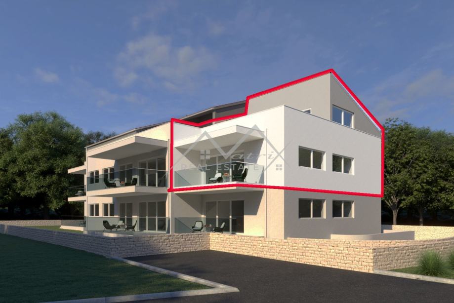 Stan se nalazi na katu zgrade i osmišljen je kako bi pružio maksimalnu udobnost. Raspored uključuje četiri spavaće sobe i tri kupaonice. Na donjoj etaži nalaze se dvije spavaće sobe, svaka sa vlastitom kupaonicom, dok su na gornjoj etaži smještene dvije dodatne spavaće sobe koje dijele jednu zajedničku kupaonicu. Gornja etaža ima i izlaz na prostranu terasu, savršenu za opuštanje ili druženja na otvorenom, s predivnim panoramskim pogledom na more.
