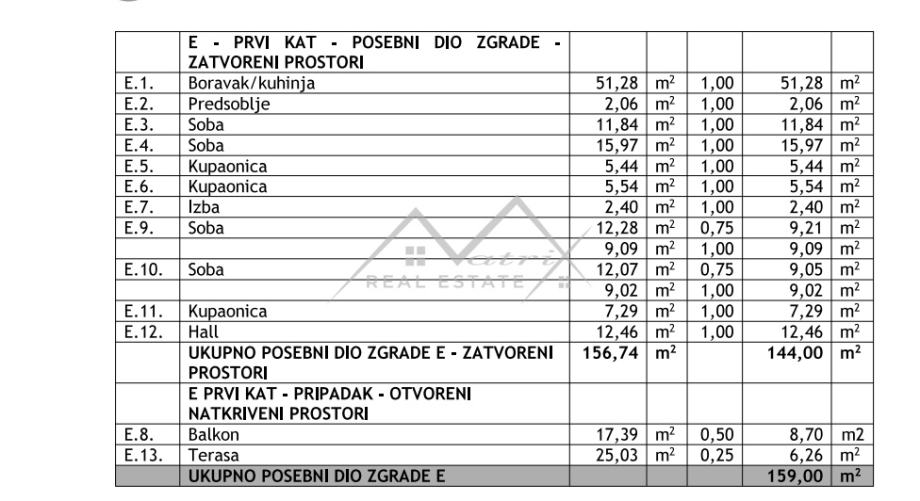 Stan se nalazi na katu zgrade i osmišljen je kako bi pružio maksimalnu udobnost. Raspored uključuje četiri spavaće sobe i tri kupaonice. Na donjoj etaži nalaze se dvije spavaće sobe, svaka sa vlastitom kupaonicom, dok su na gornjoj etaži smještene dvije dodatne spavaće sobe koje dijele jednu zajedničku kupaonicu. Gornja etaža ima i izlaz na prostranu terasu, savršenu za opuštanje ili druženja na otvorenom.