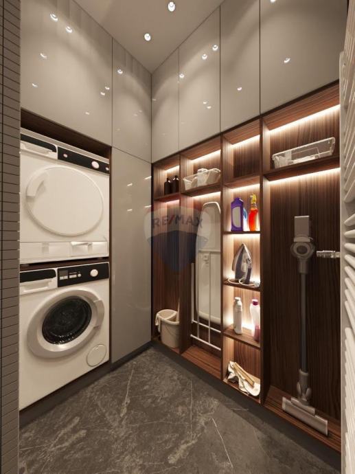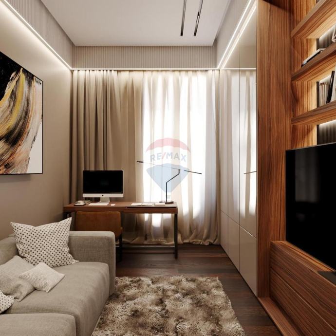 Dizalom se iz podzemne garaže stiže u stan koji se sastoji od dnevnog boravka, blagovaonice i kuhinje, dvije spavaće sobe, wc-a, praone, kupaonice, garderobe i hodnika, sve ukupne površine 96,30 m2.