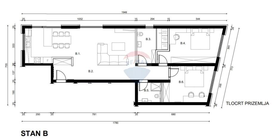 Predmetni stan B nalazi se u prizemlju ove moderne zgrade i broji ukupno 109 m2 korisne površine.
