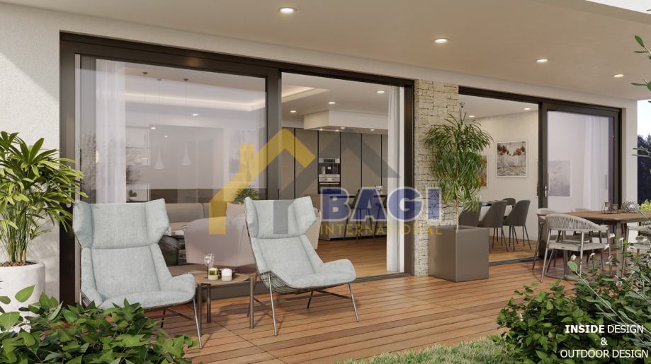 Prostrani stan osmišljen je u svakom detalju i izgrađen s visokokvalitetnim materijalima te se nalazi u prizemlju. Sastoji se od ulaznog hodnika, otvorene kuhinje, blagovaonice i dnevnog boravka otvorenog prema terasama, gostinjskog WC-a, ostave i 2 spavaće sobe s garderobom i vlastitim kupaonicama. Površina stana iznosi 148,73 M2.