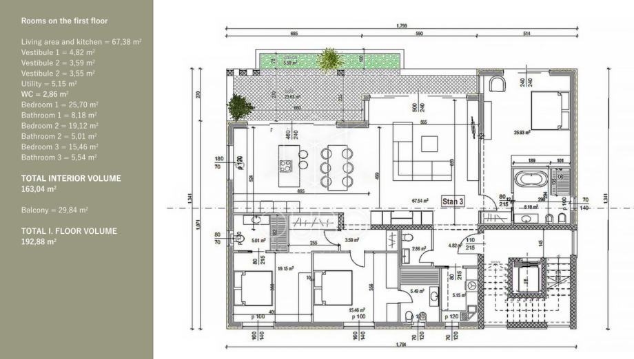 Stanovi su kreirani za kupce koji očekuju vrhunsku estetiku i funkcionalnost. Prostrani dnevni boravci otvorenog koncepta, velike terase i tri spavaće sobe s vlastitim kupaonicama pružaju razinu privatnosti i standard usporediv s boutique hotelima. Premium materijali, Schüco aluminijska stolarija, podno grijanje, Mitsubishi toplinske pumpe i Kone dizalo zaokružuju osjećaj modernog komfora.