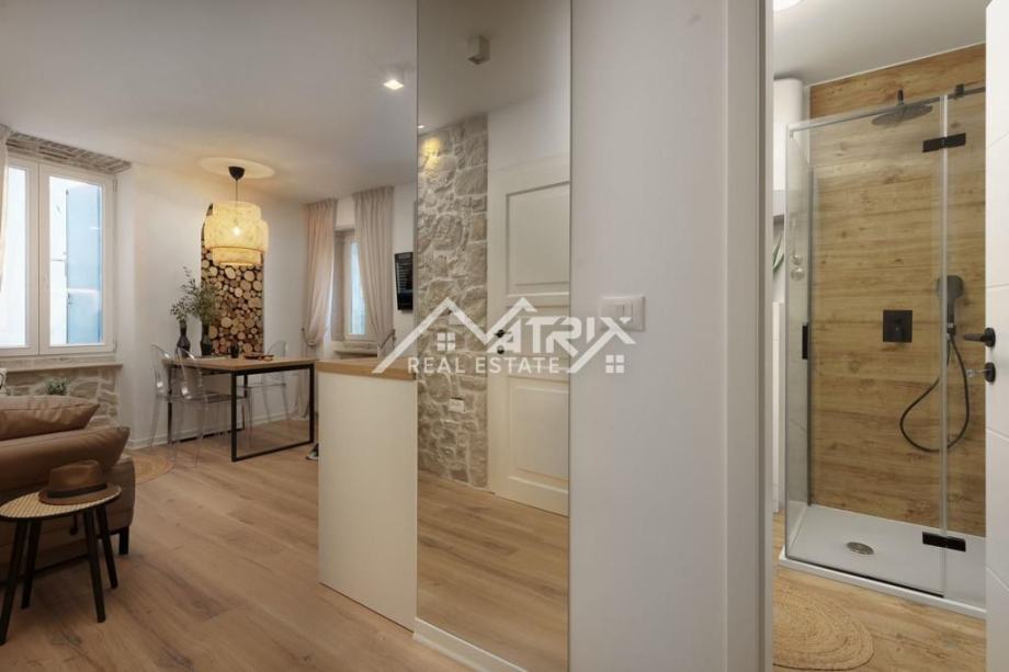 Dobrodošli u ovaj luksuzan stan smješten u srcu starog grada Rovinja. Nekretnina se prostire na ukupnoj stambenoj površini od 50 m2 te je potpuno adaptirana 2022. godine. Stan je opremljen modernim dizajnerskim namještajem s potpisom, stvarajući suvremen i elegantan ambijent.