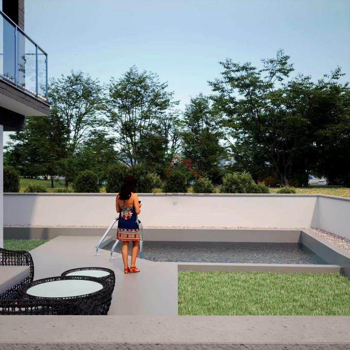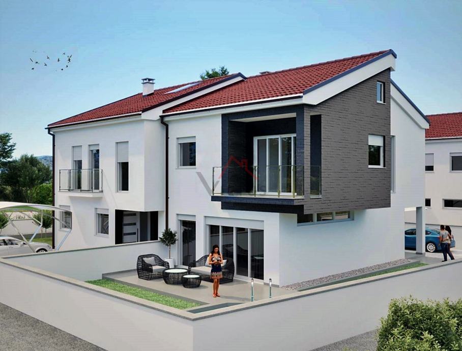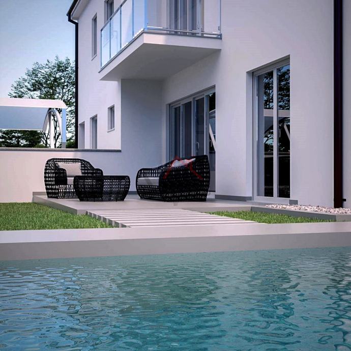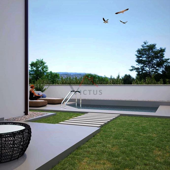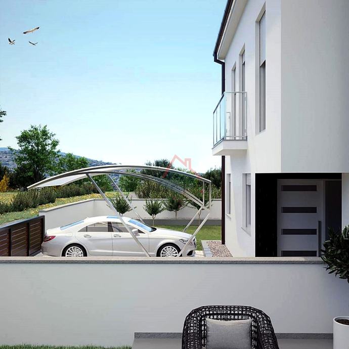 Ova prekrasna, moderna novogradnja ima fizički odvojen prilaz, uređeno i ograđeno zemljište sa vlastitim parkirnim mjestima i vanjski bazen.
