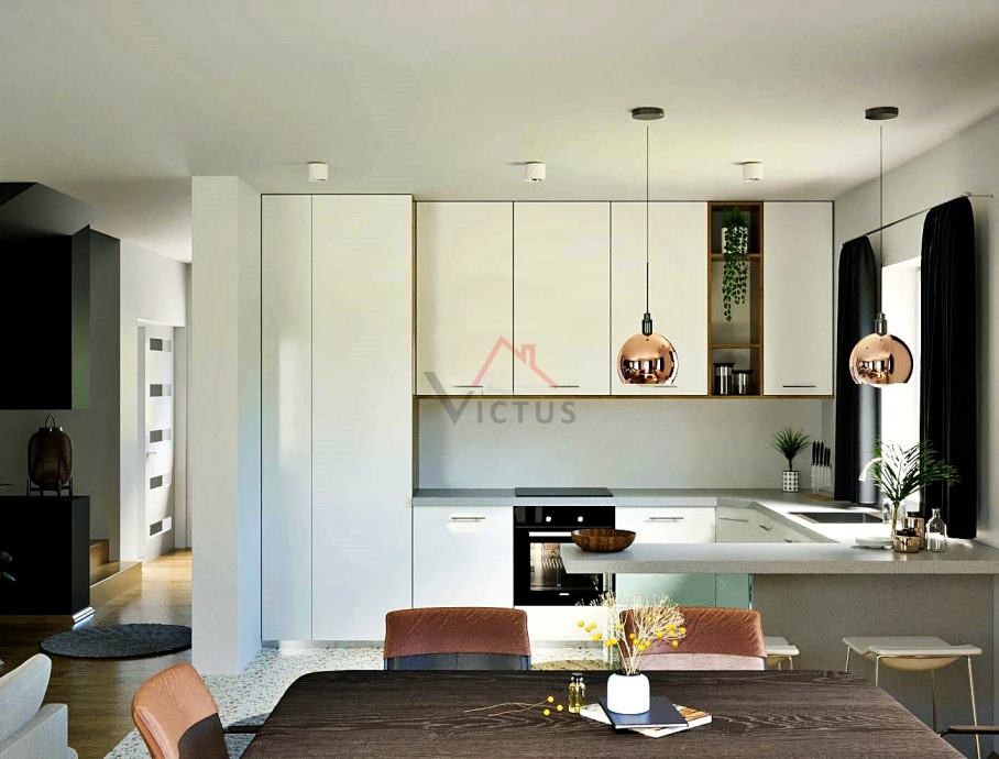 Prizemlje nudi dnevni boravak sa blagovaonom i otvorenom kuhinjom, ostavu, kupaonicu i ulazni dio sa prekrasnim stubištem koji vodi na 1. kat ove nekretnine.