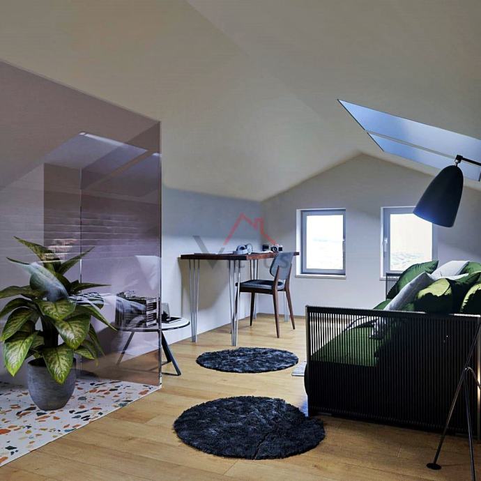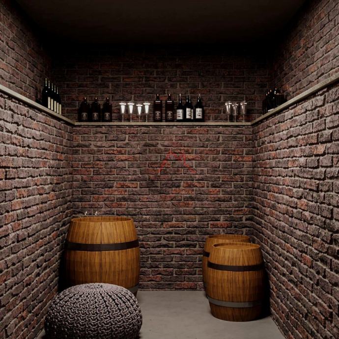 Nailazimo na predsoblje, 3 spavaće sobe te 2 kupaonice i balkon. Potkrovlje nudi još jednu spavaću sobu sa krovnim prozorom te vlastitu kupaonicu. U vili se nalazi i jedan vinski podrum, veličine je 10 m2.