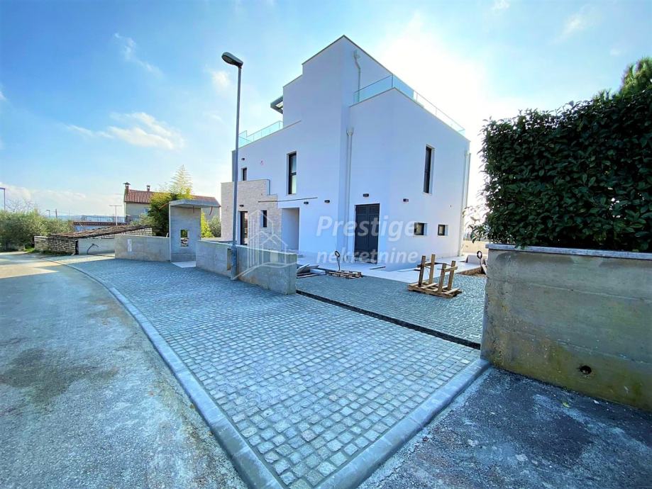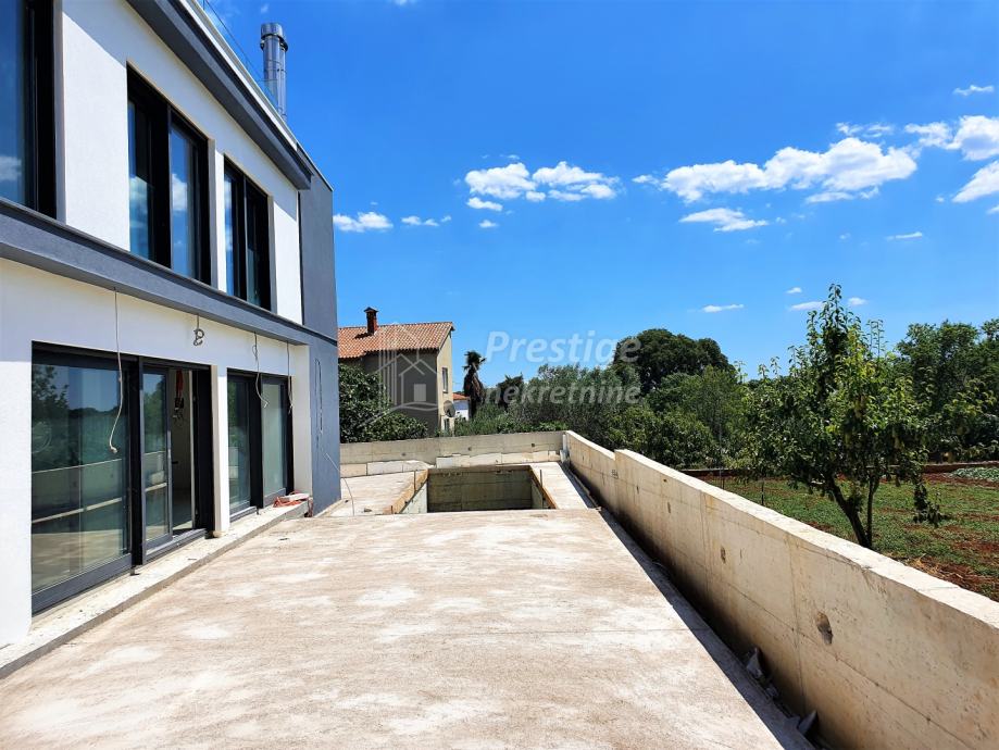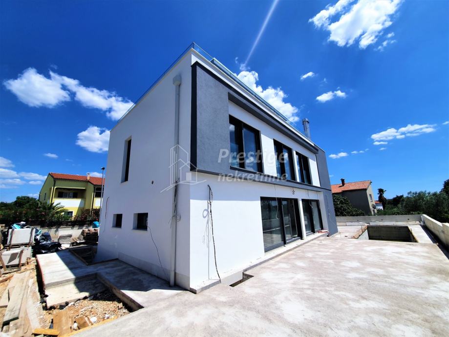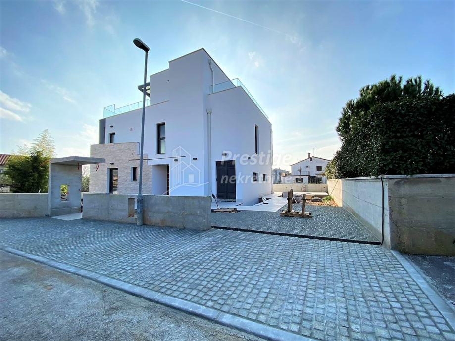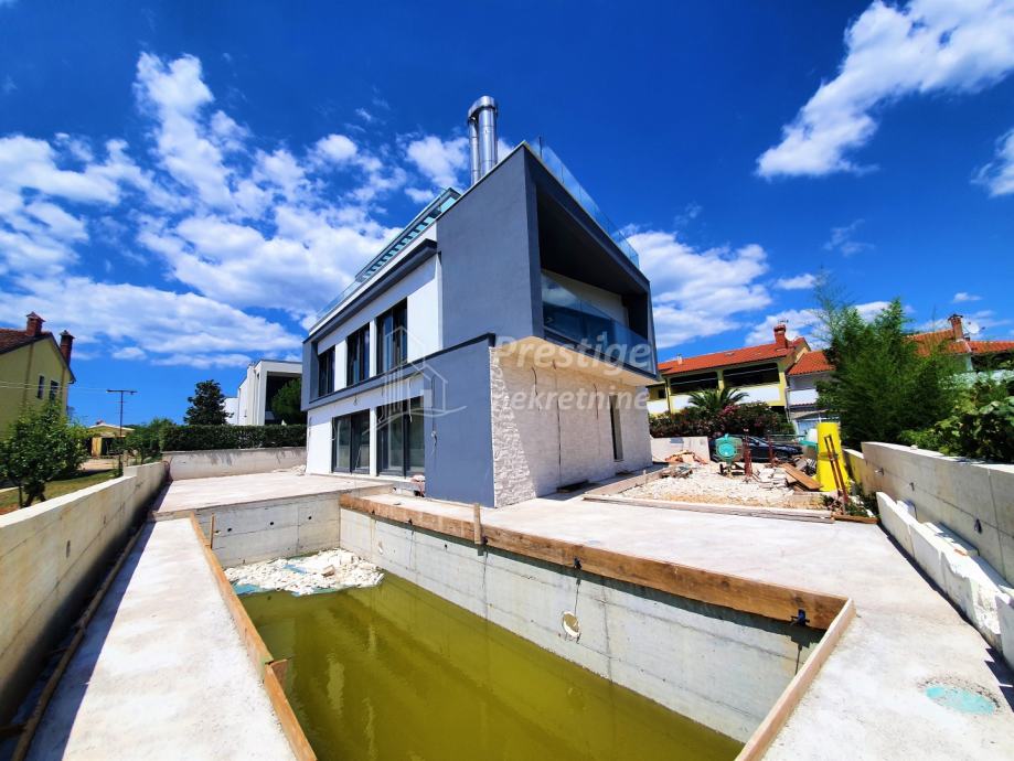 Na prodaju je prekrasna, moderna vila u izgradnji. Vila se nalazi izvrsnoj lokaciji na samom ulazu u grad, u mirnom naselju okruženom obiteljskim kućama, a opet u blizini bitnih prometnica. Praktičan raspored kuće daje mogućnost za miran i ugodan obiteljski život. U podrumu se nalazi konoba s kuhinjom i krušnom peći, dvije sobe, kupaonica te servisne prostorije. U prizemlju je prostrani dnevni boravak s ogromnim kliznim stijenama napravljenih od najkvalitetnijih materijala te još jedna soba i kupaonica. Na katu su još dvije prostrane sobe i još jedna kupaonica te glavna spavaća soba sa zasebnom, luksuznom kupaonicom i garderobom i izlazom na široku privatnu terasu. Zadnja etaža je predviđena za wellness s Jacuzzi masažnom kadom, tušem, saunom i velikom terasom-sunčalištem. Iz dnevnog boravka u prizemlju izlazi se na veliku terasu s bazenom veličine 10x3m opremljenim vlastitom strojarnicom, a voda u bazenu po potrebi može biti i grijana kako bi se u njemu moglo uživati kroz veći dio godine. U gradnji kuće su korišteni samo najkvalitetniji građevinski materijali, vila ima podno grijanje kroz sve etaže, klimatizaciju, a u cijeni je i opremanje vrhunskim namještajem. Gradnja je već u poodmakloj završnoj fazi. Vlasništvo uredno.