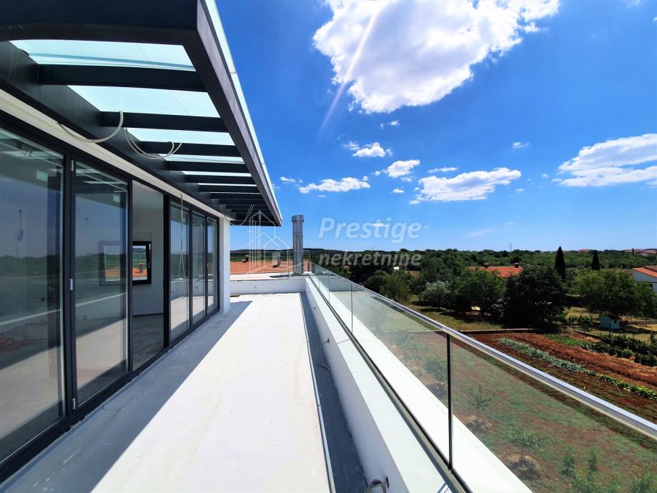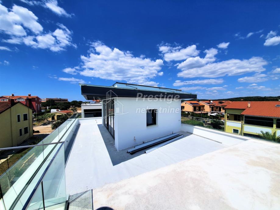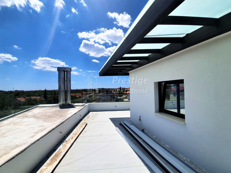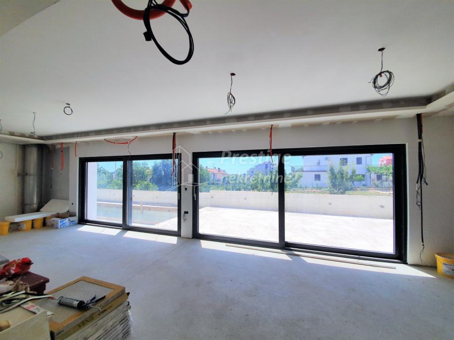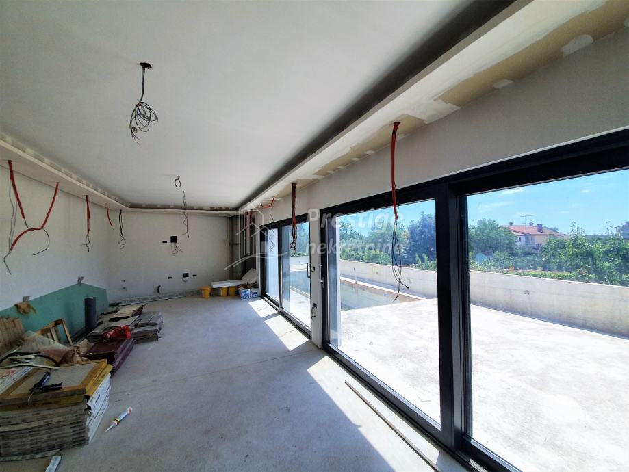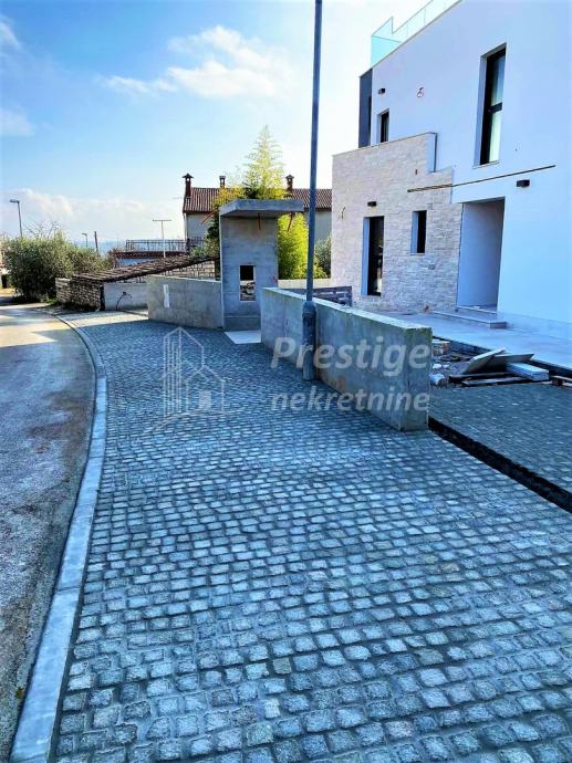 Na prodaju je prekrasna, moderna vila u izgradnji. Vila se nalazi izvrsnoj lokaciji na samom ulazu u grad, u mirnom naselju okruženom obiteljskim kućama, a opet u blizini bitnih prometnica. Praktičan raspored kuće daje mogućnost za miran i ugodan obiteljski život. U podrumu se nalazi konoba s kuhinjom i krušnom peći, dvije sobe, kupaonica te servisne prostorije. U prizemlju je prostrani dnevni boravak s ogromnim kliznim stijenama napravljenih od najkvalitetnijih materijala te još jedna soba i kupaonica. Na katu su još dvije prostrane sobe i još jedna kupaonica te glavna spavaća soba sa zasebnom, luksuznom kupaonicom i garderobom i izlazom na široku privatnu terasu. Zadnja etaža je predviđena za wellness s Jacuzzi masažnom kadom, tušem, saunom i velikom terasom-sunčalištem. Iz dnevnog boravka u prizemlju izlazi se na veliku terasu s bazenom veličine 10x3m opremljenim vlastitom strojarnicom, a voda u bazenu po potrebi može biti i grijana kako bi se u njemu moglo uživati kroz veći dio godine. U gradnji kuće su korišteni samo najkvalitetniji građevinski materijali, vila ima podno grijanje kroz sve etaže, klimatizaciju, a u cijeni je i opremanje vrhunskim namještajem. Gradnja je već u poodmakloj završnoj fazi. Vlasništvo uredno.