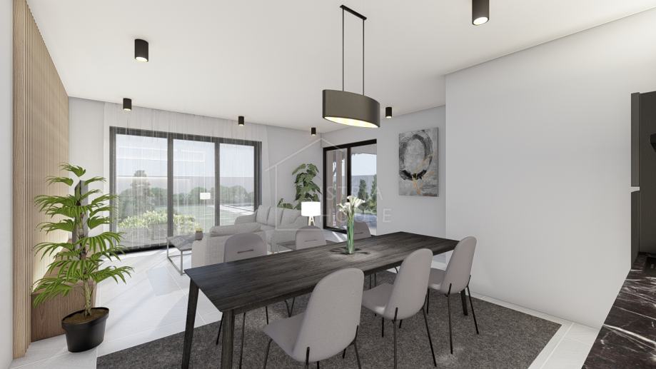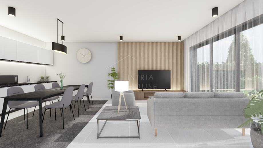 Open space dnevni prostor ističe se suvremenim dizajnom i visokokvalitetnim materijalima. Prostrana dnevna soba, blagovaonica i kuhinja stvaraju fluidan i povezan prostor, obogaćen prirodnom svjetlošću koja ulazi kroz prozore.