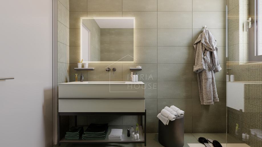Stan se prodaje nenamješten, osim kupaonica koje će biti kompletno opremljene. S time da budući kupac ima mogućnost,ako mu se namještaj sa slika vizualizacije svidio, da mu se stan kompletno opremi sa identičnim namještajem koji je na slici.