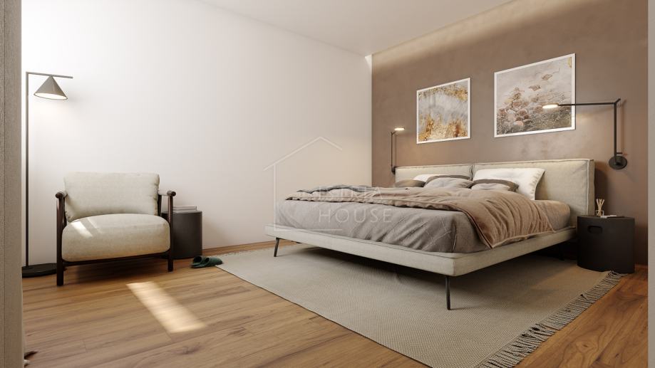 Ovaj stan od 143.73 m2 ima dvije spavaće sobe, svaka sa svojom kupaonicom te svojom garderobom. Blagavaona, dnevni boravak i kuhinja činit će jednu jedinstvenu cjelinu sa koje će se pružati pogled prema vrtu i terasi preko staklene stijene.