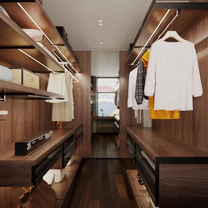 Dizalom se iz podzemne garaže stiže u stan na 2. katu koji se sastoji od: tri spavaće sobe, svaka sa svojom kupaonicom, praone, hodnika te loggia. Potkrovlje se sastoji od: dnevnog boravka, blagovaonice i kuhinje, kupaonice te krovne terase s koje se pruža predivan pogled na more i stari grad.