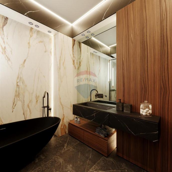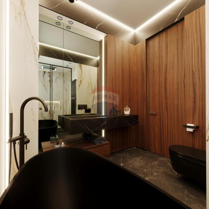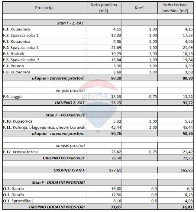 Dodatni prostori: pripadajuća dva parking mjesta u garaži i spremište u garaži. Sveukupna obračunska površina stana iznosi 182 m2. Neto korisna površina penthousa iznosi 165,95 m2.