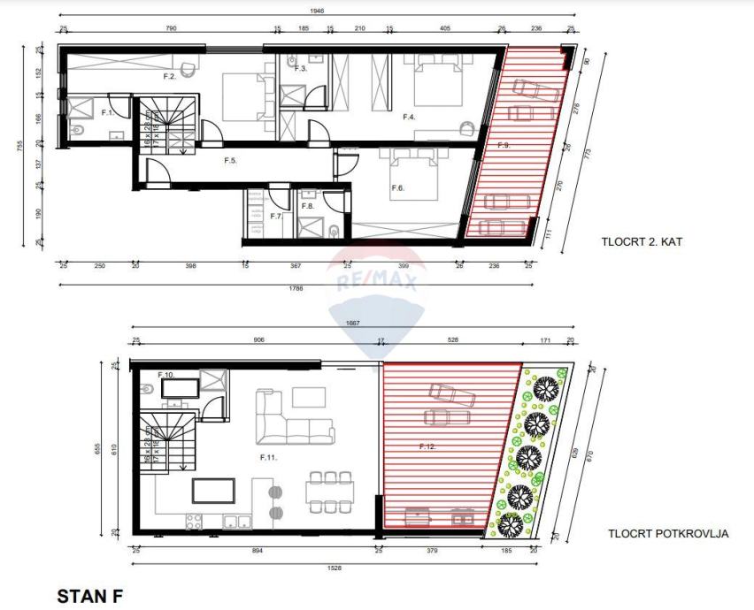 Predmetni penthouse ''F'' nalazi se na 2. katu ove moderne zgrade i broji ukupno 182 m2 korisne površine kroz 2 etaže.
